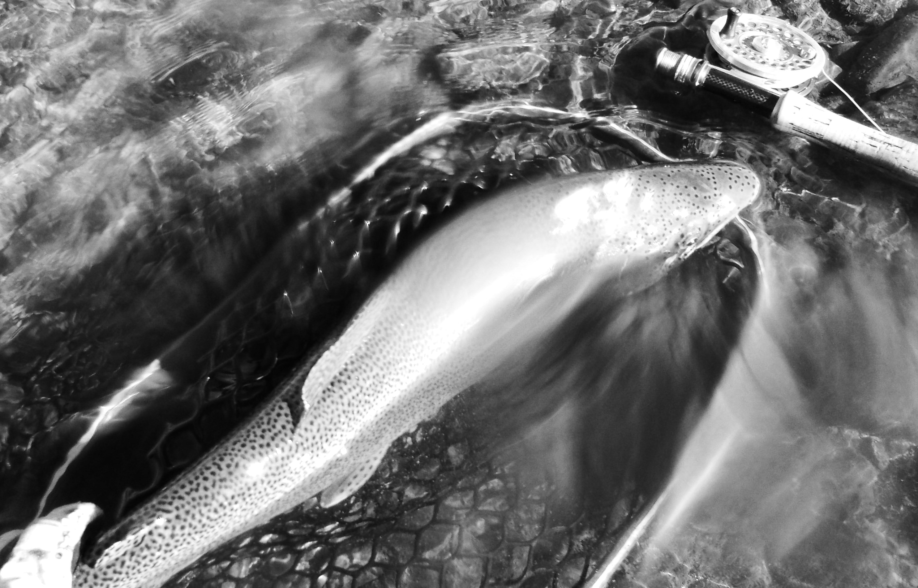 “It’s down there. Down there somewhere in that coulee. The mother of all trout. A brand new Sage One rod for the first person who spots it. You spot it and I’ll catch it. I’ve got this cricket on my line. A black cricket. Look at those spindly rubber legs. It will be irresistible to the one with the big fins. It will fool him. I know it will fool him. It has fooled me. Come on let’s go way down into the coulee. It’s not as far as it looks. A Sage One. Hear that! A Sage One for the first person who spots him. I’ll flick a cricket at big fins. Well see what he says about that. I’ll flick a cricket with a shiny belly. I just have to get the right drift. It’s all about the right drift. If I get the right drift then all hell will break loose.”