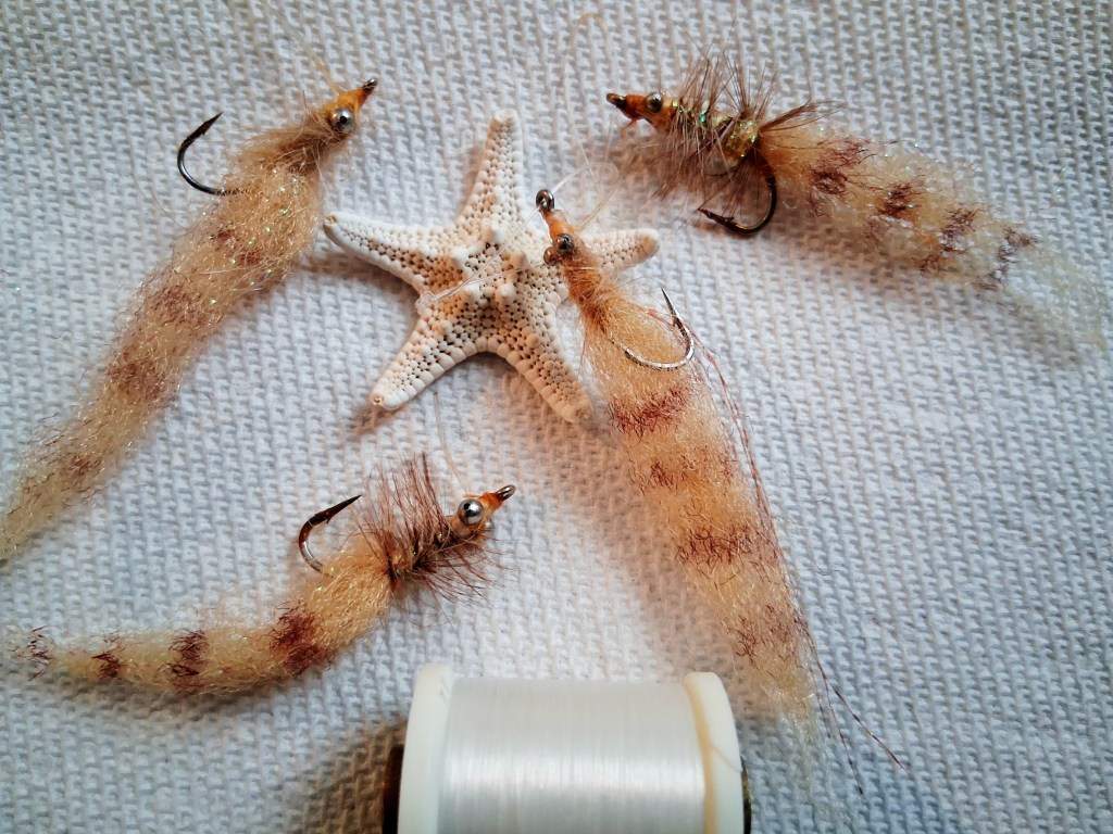 Redfish flies. There are hundreds of shrimp, crab, and baitfish patterns out there. Not unlike the immense number and variety of trout flies. They come in all sizes, shapes and colors. There are many regional differences and preferences. There are different patterns for murky water vs clear. Fly design can also vary based on the type of bottom the Redfish are feeding on such as Oyster beds; thick dense grass; sparse shoal grass; mud; pothole areas; sand. And there are different head weights depending on the depth an angler will be fishing. Some patterns have rubber legs to create action, some realistic eyes, and so on…