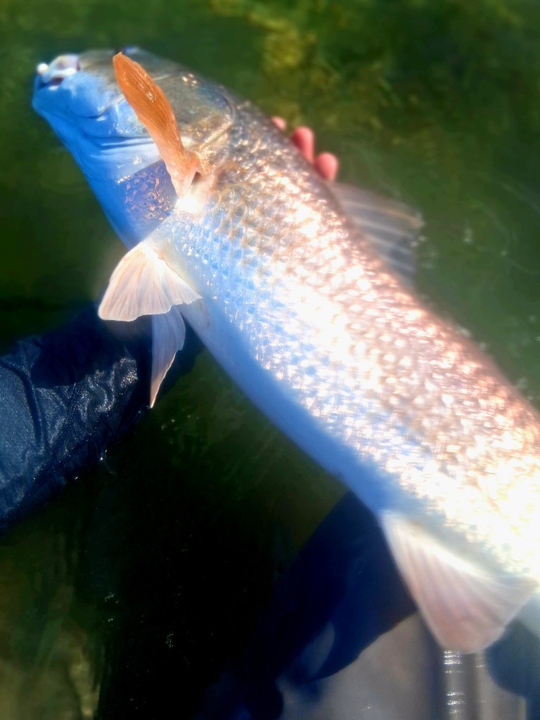 Redfish generally aren’t know to be picky eaters… that is until they are. I’ve had many follow my moving fly until I had no more fly line to strip and was down to my leader. I’m sure clear water feeding fish are harder to dupe than fish in cloudy, muddy water; same with calm vs choppy water; light conditions can be a factor such as the quality of the light (brightness) or the angle of the Sun’s rays; food presence or lack of can influence their feeding behavior; as does Tide phase and water temperature, which can change quickly in the ultra shallow bay that I fish; competition from other Redfish (those searching and feeding in schools vs solitary fish) influence feeding; as well as innumerable other factors that I’m simply not aware of. It’s all part of Nature’s mystery. And it’s the mystery that keeps you coming back.