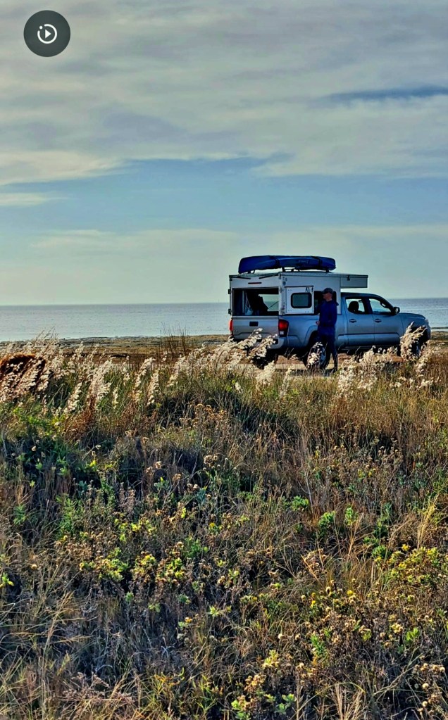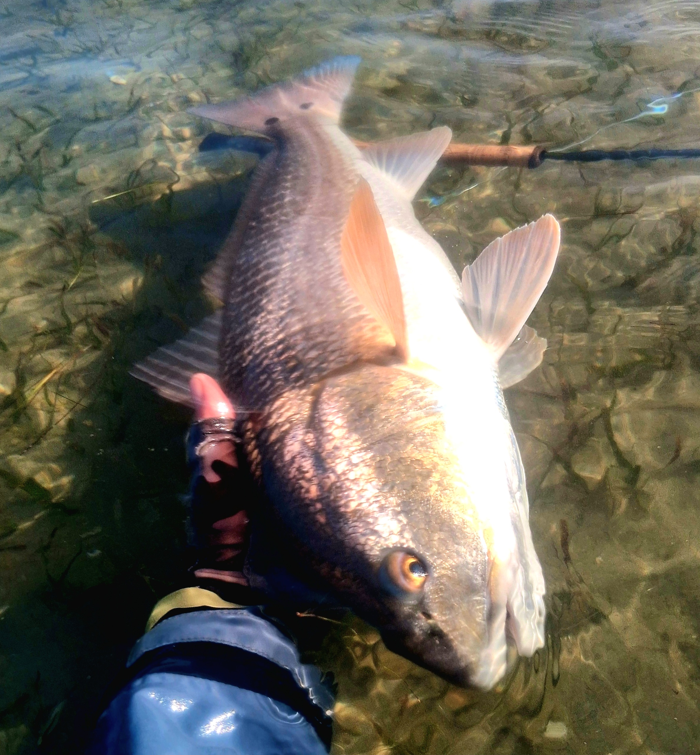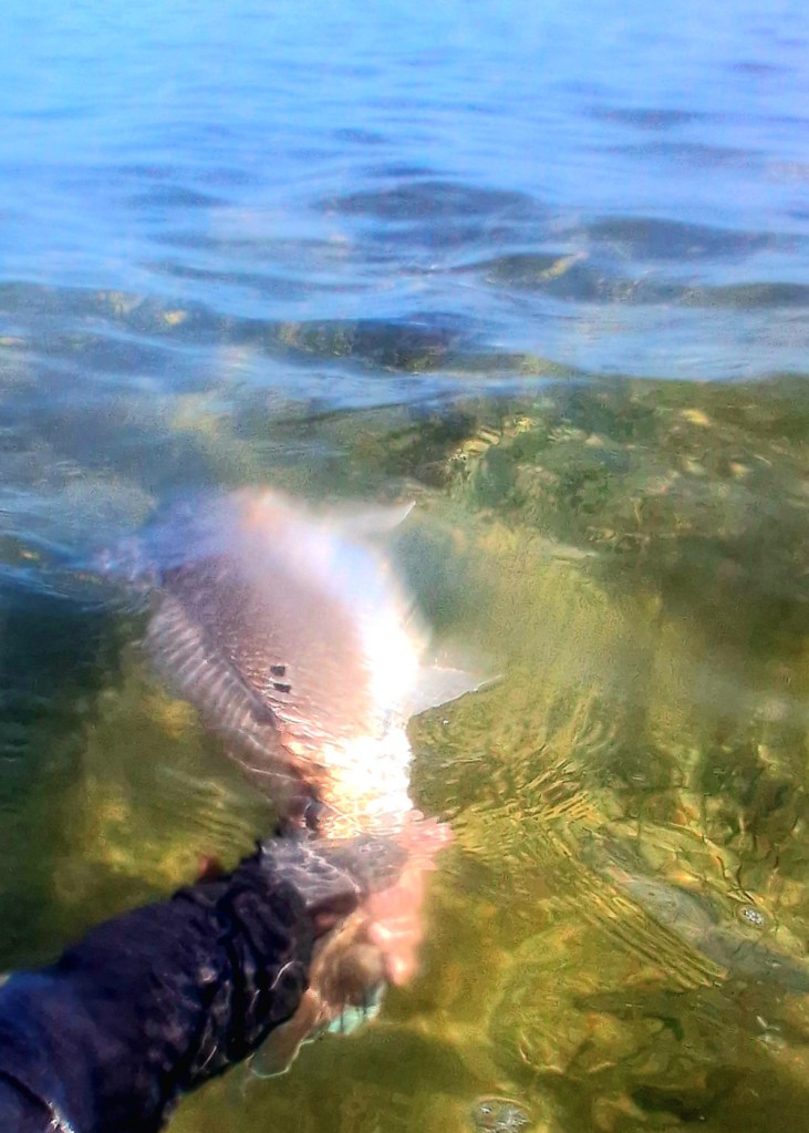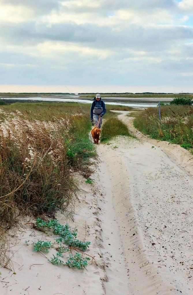 I rarely see anglers there on foot…that’s one of the reasons I go there. It is also a bit off season and weather unpredictable.I generally have the place to myself…mile after mile….could go 10-15 miles up bay on foot and see no one except coyotes, deer, rabbits. Saw one other angler this trip. A spin fisherman named Chris catching supper. The odd skiff goes by…casts and then leaves. That’s it. Tough place to sightfish fish as can be windy most days. Clouds mean glare…tough seeing, missed fish. Got to put in your time and search..fish spook easily in shallows. That said, the chance to spot and catch a 25 to 30 inch Red in knee deep water on a fly rod makes the effort I put in there worthwhile…some fish even bigger. Barrier island I’m on is dog friendly…beach , hotels, another reason I go.