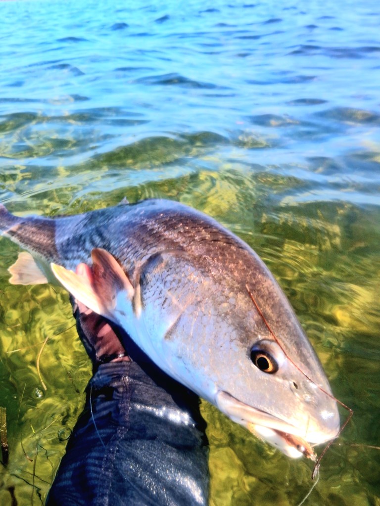 On rare calm mornings in the super transparent shallows slow moving Redfish and stationary feeders (head down) often wouldn’t eat my larger flies or bulky ones. Small and sparse flies seemed best along with soft landings and careful wading. Some of those fish seemed focused on small crabs.