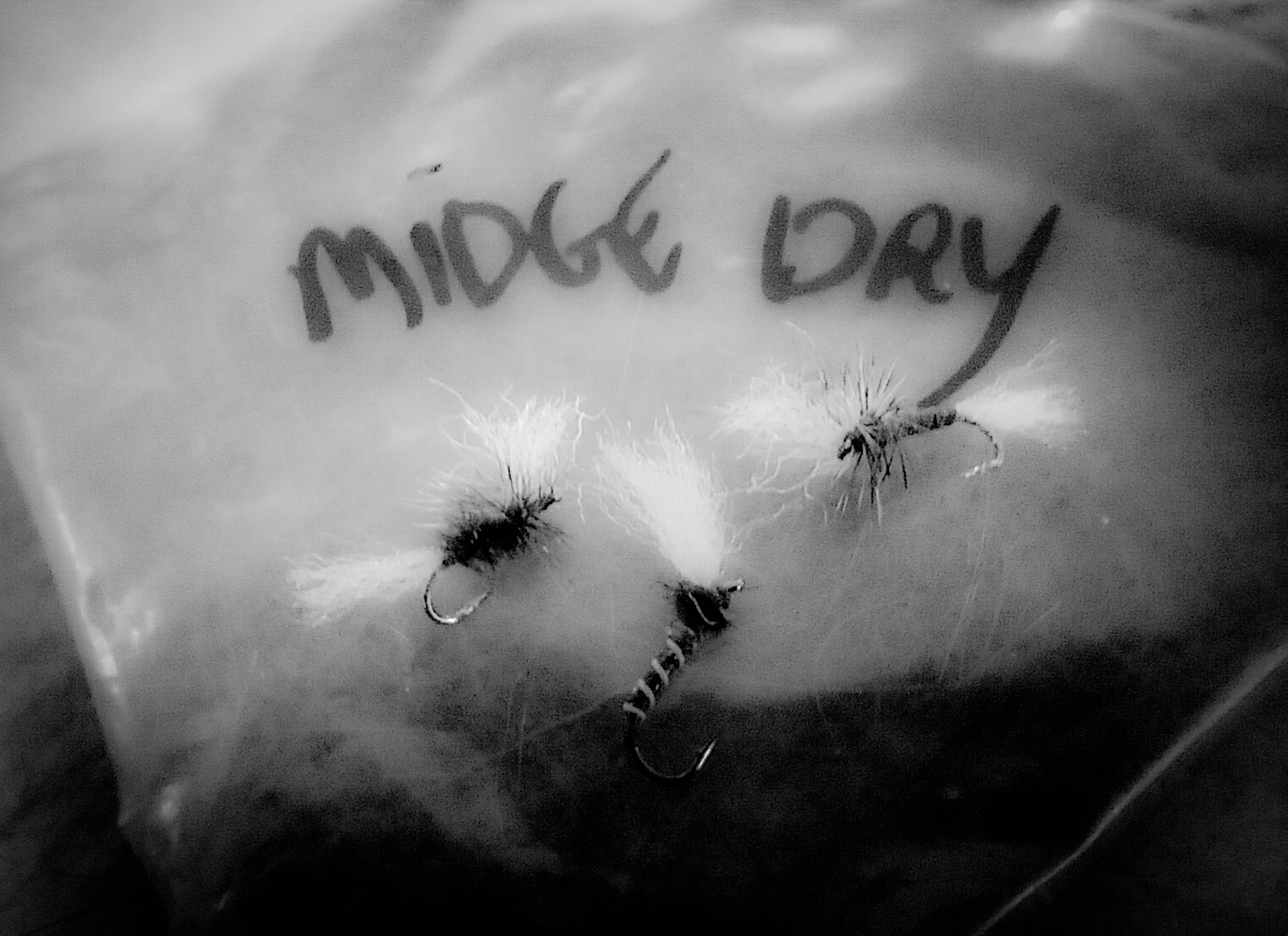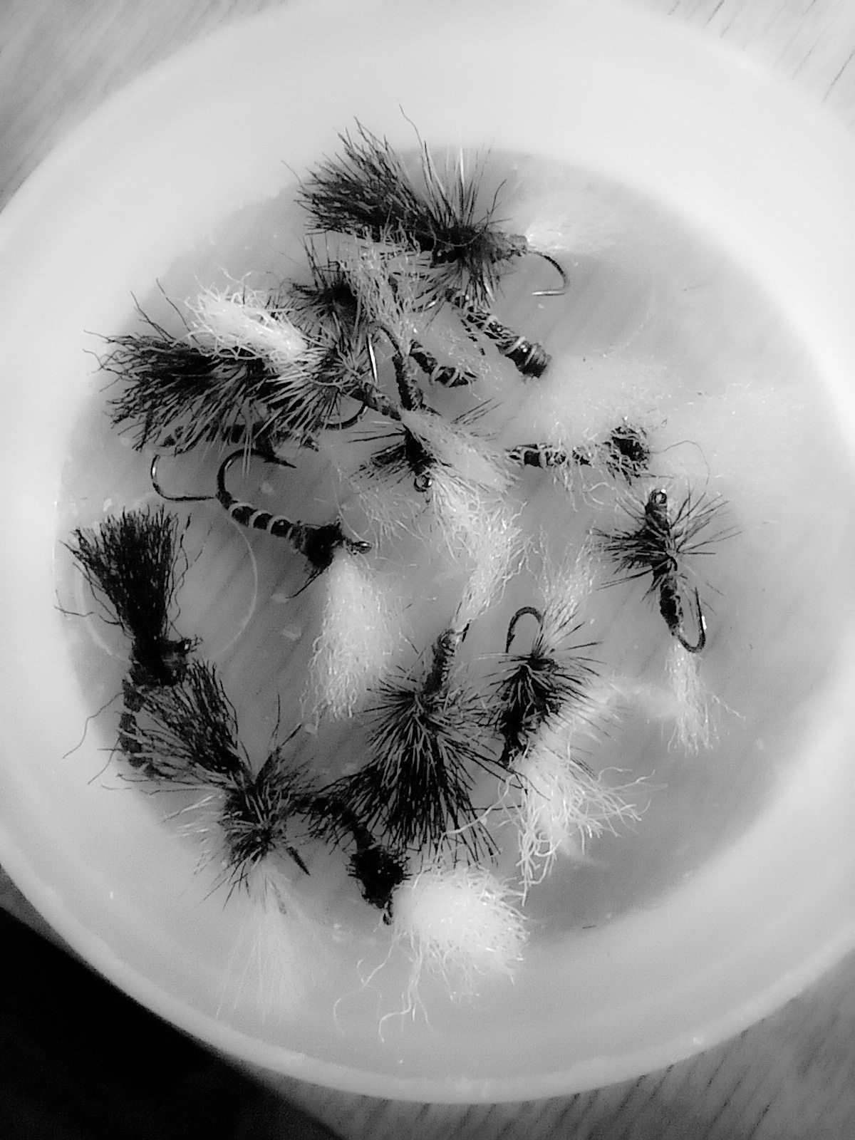 Some midge dry flies. Some tied with a trailing shuck. Some with a wire segmentation to pull body below surface (emerger). Black and white/light grey wings for visibility on broad rivers: size 18-20. Quick ties…