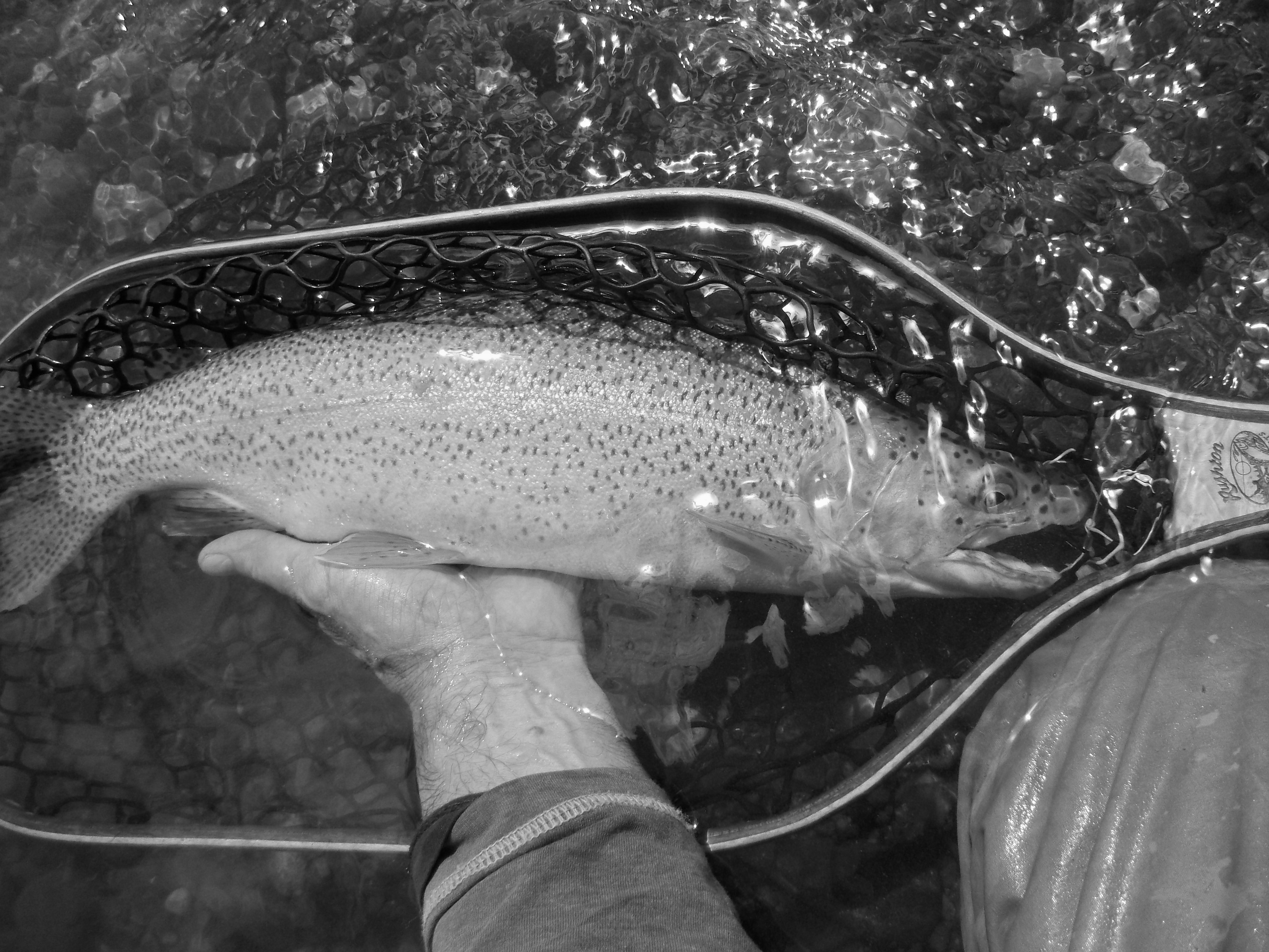 Here’s a nice Crowsnest rainbow that was located feeding on a shadowy bank. Caught on a size 18, BWO hacklestacker pattern.