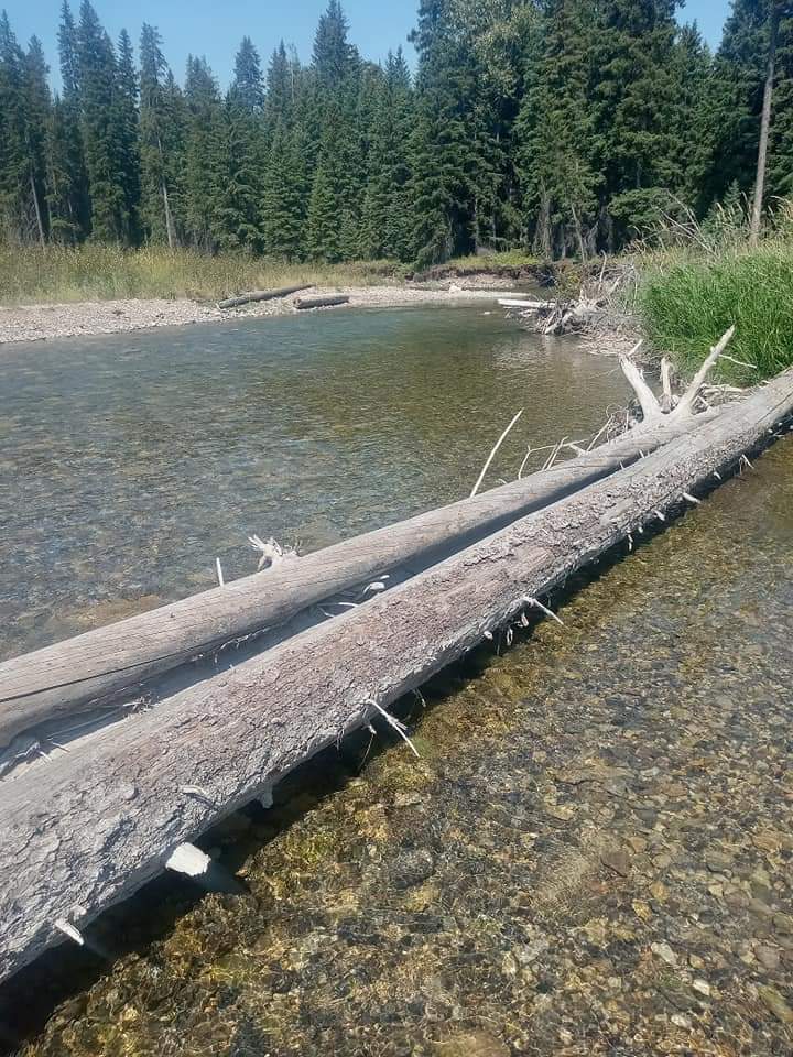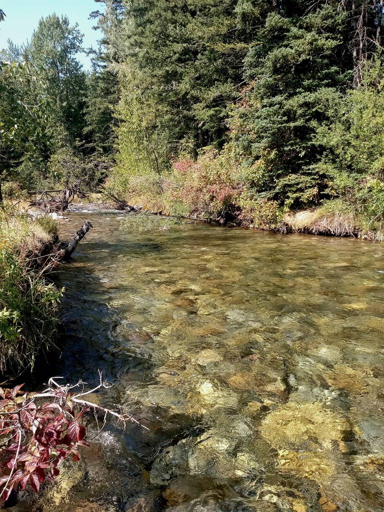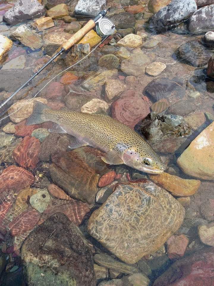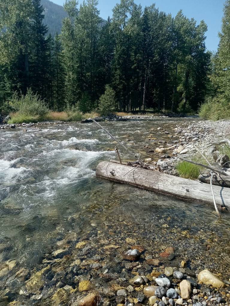 Rumble river. I never see anyone there. I notice the occasional boot print in riverside mud or silt but it is usually near a road access. And I did spotted a big foam dry fly hanging from a branch by some lower river homes. However, as I walk km after km upstream I generally see no other traces of significant angling pressure. The fish, colorful Cutthroats, have few or no hook marks on them. Most don’t look like they have been handled at all. That’s rare for most regional trout streams. They also fight with every cell in their body. Fish that have been caught over and over simply give up once hooked; offer little resistance; have no spirit. The trout in this river are different. They are more than willing to Rumble and use the fast water, boulders, willow branches, and log jams to their full advantage. Landing a sizeable one is always an accomplishment.