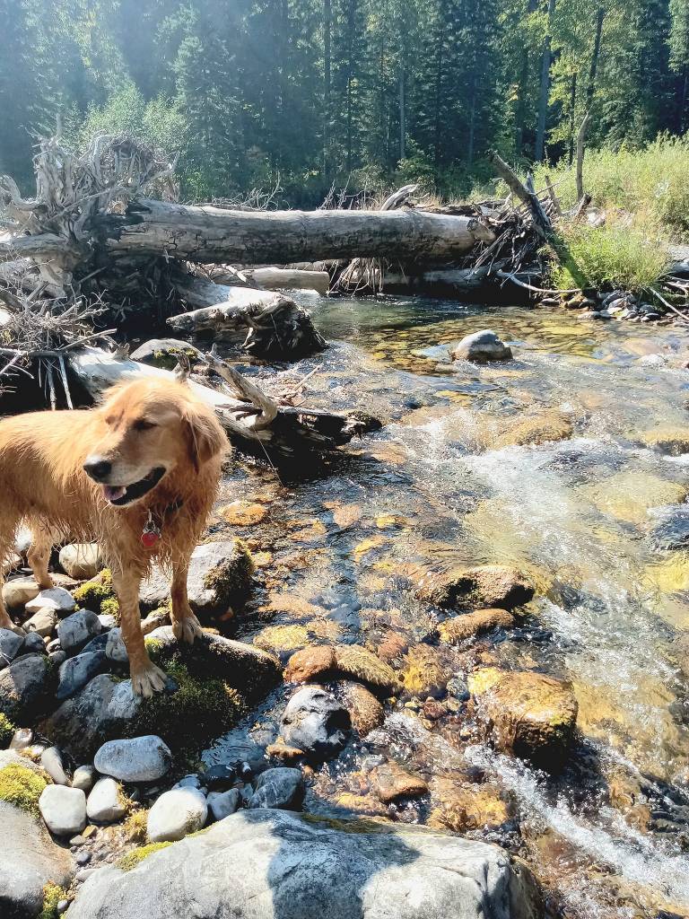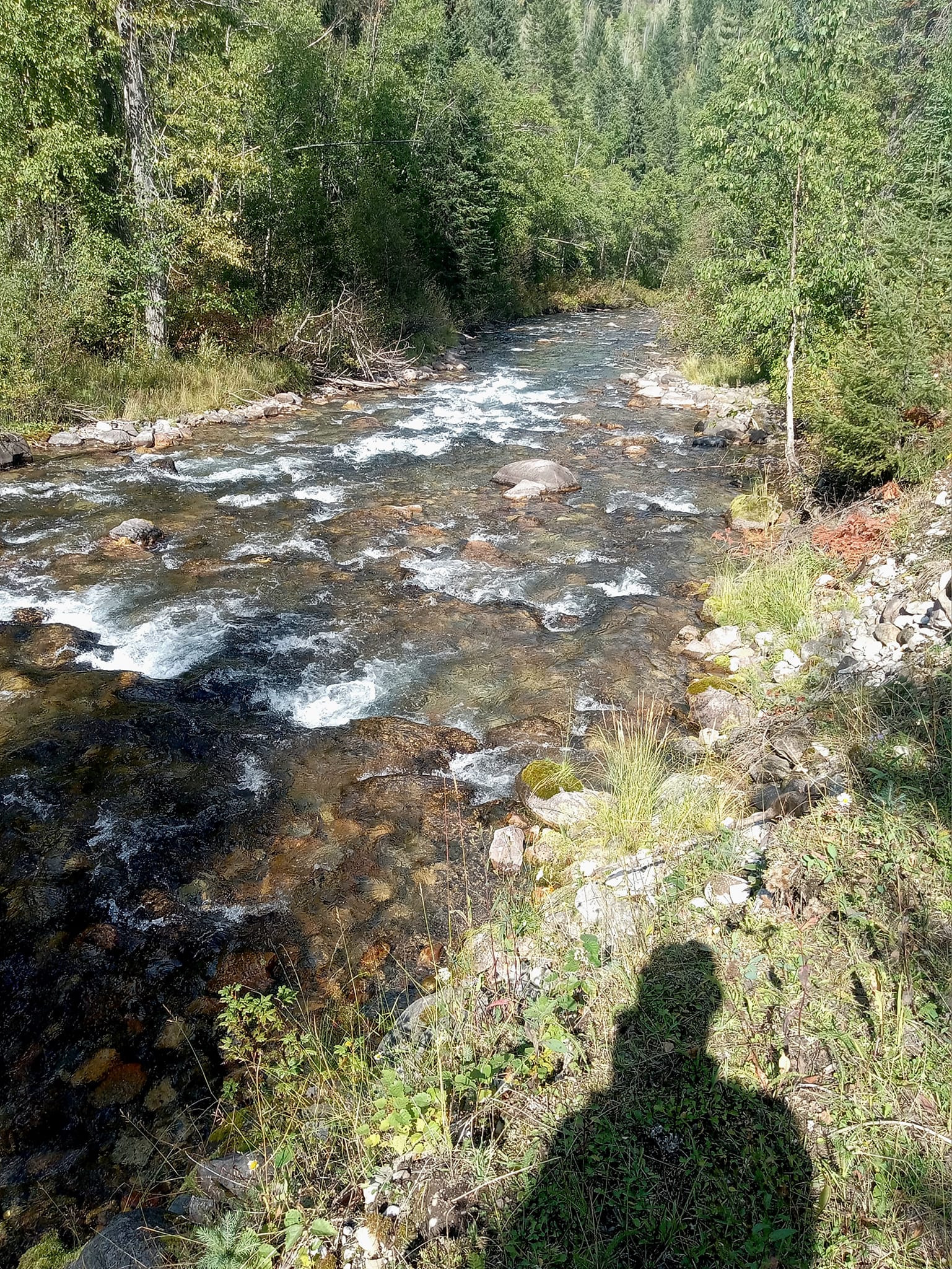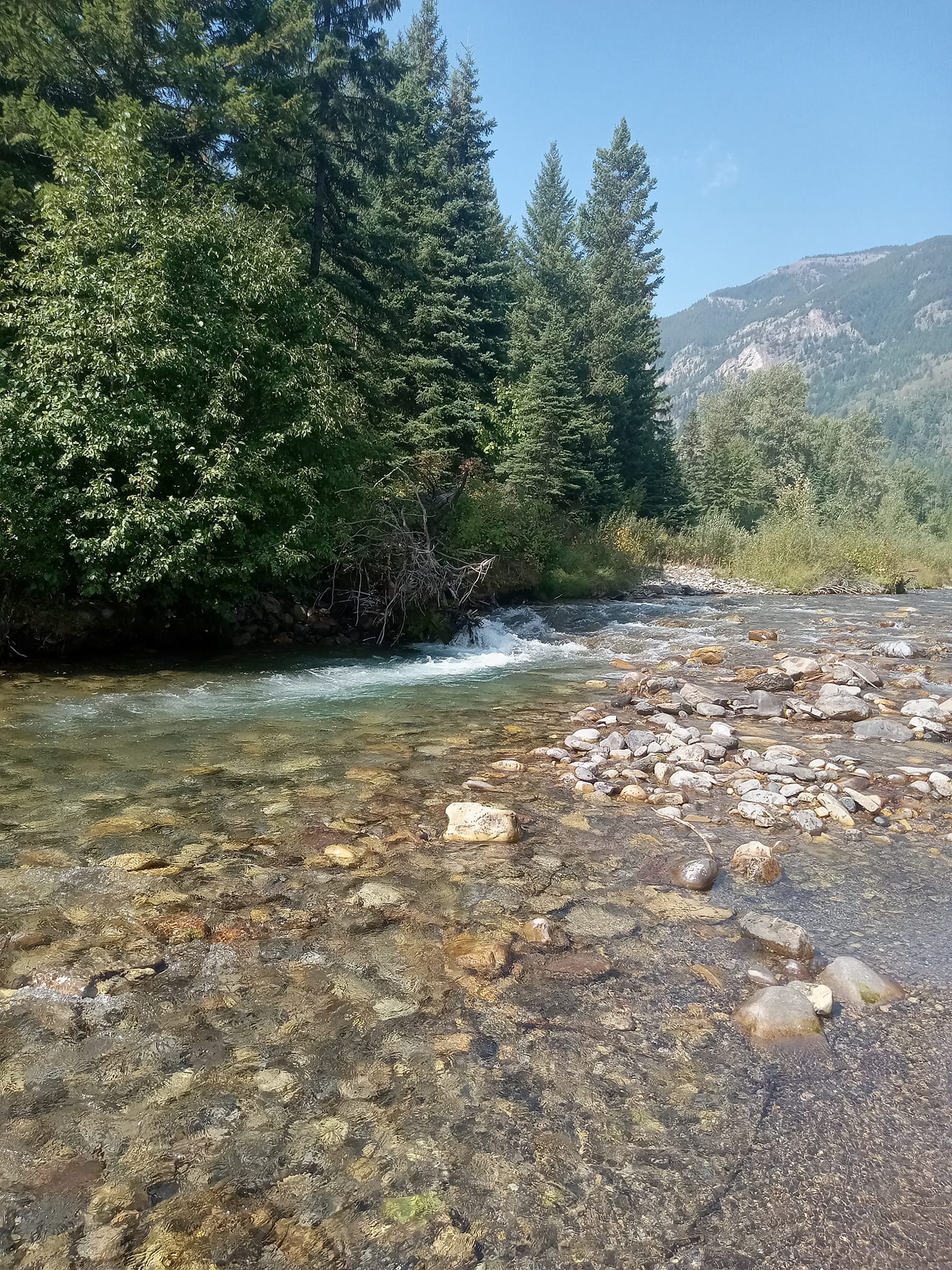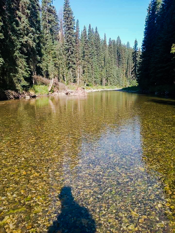 When I entered the mountain river at 11am my water thermometer read, 10c/ 51f. Almost half the air temperature. By 2pm the river was only 54f and my feet still numb. The stream had stayed cold in spite of two solid weeks and now entering a third week of extreme heat. One small creek that feeds the river was still flowing. Last year it was dry in late July. I thought that there was probably still some snow melting up high. It was probably one of many creeks helping the river stay cold when many lower elevation rivers were warming well into the 15c plus/60f and some approaching 20c/70f. Cold water in July and August is always good for trout and fishing.