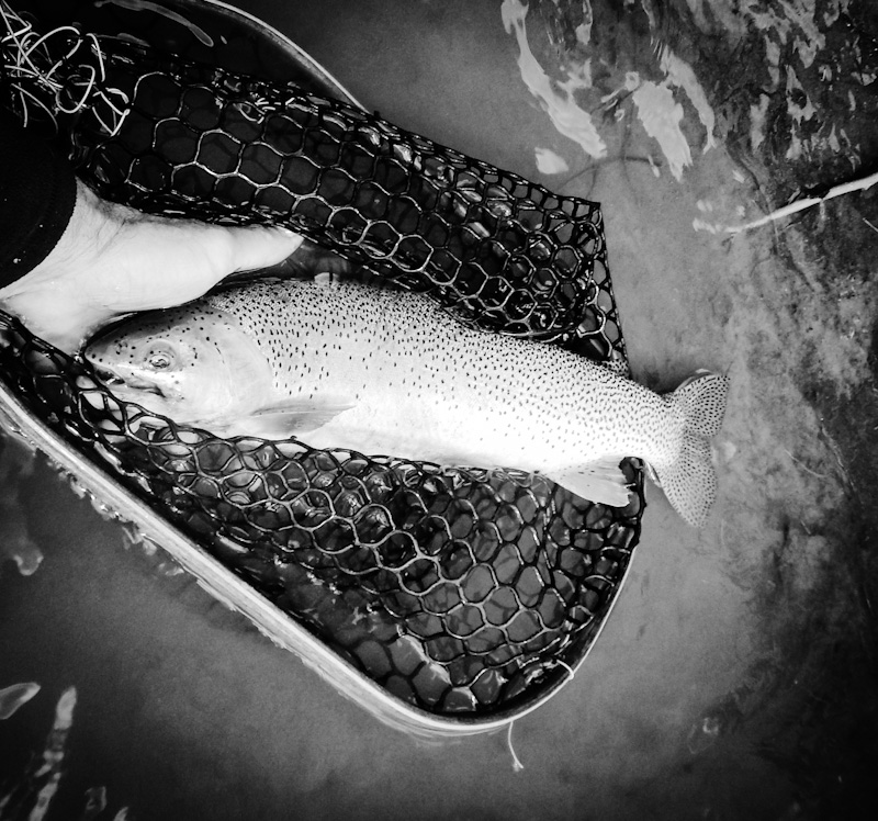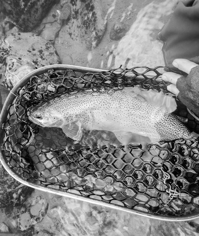 Trout, even cautious big ones, seem more willing to risk rising for tiny morsels in low light. Below, some nice low light rainbow trout caught sight-fishing with small Pale Morning Dun dry flies, hook size 16 and 18. Low fronts, low light…your signal to head to the river with your rain jacket and dry flies.