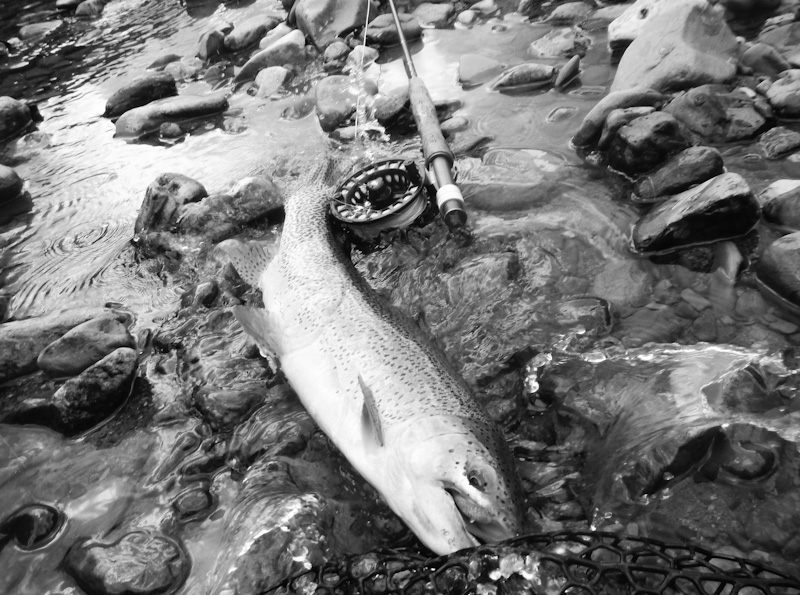 Rumble river. I never see anyone there. I notice the occasional boot print in riverside mud or silt but it is usually near a road access. And I did spotted a big foam dry fly hanging from a branch by some lower river homes. However, as I walk km after km upstream I generally see no other traces of significant angling pressure. The fish, colorful Cutthroats, have few or no hook marks on them. Most don’t look like they have been handled at all. That’s rare for most regional trout streams. They also fight with every cell in their body. Fish that have been caught over and over simply give up once hooked; offer little resistance; have no spirit. The trout in this river are different. They are more than willing to Rumble and use the fast water, boulders, willow branches, and log jams to their full advantage. Landing a sizeable one is always an accomplishment.