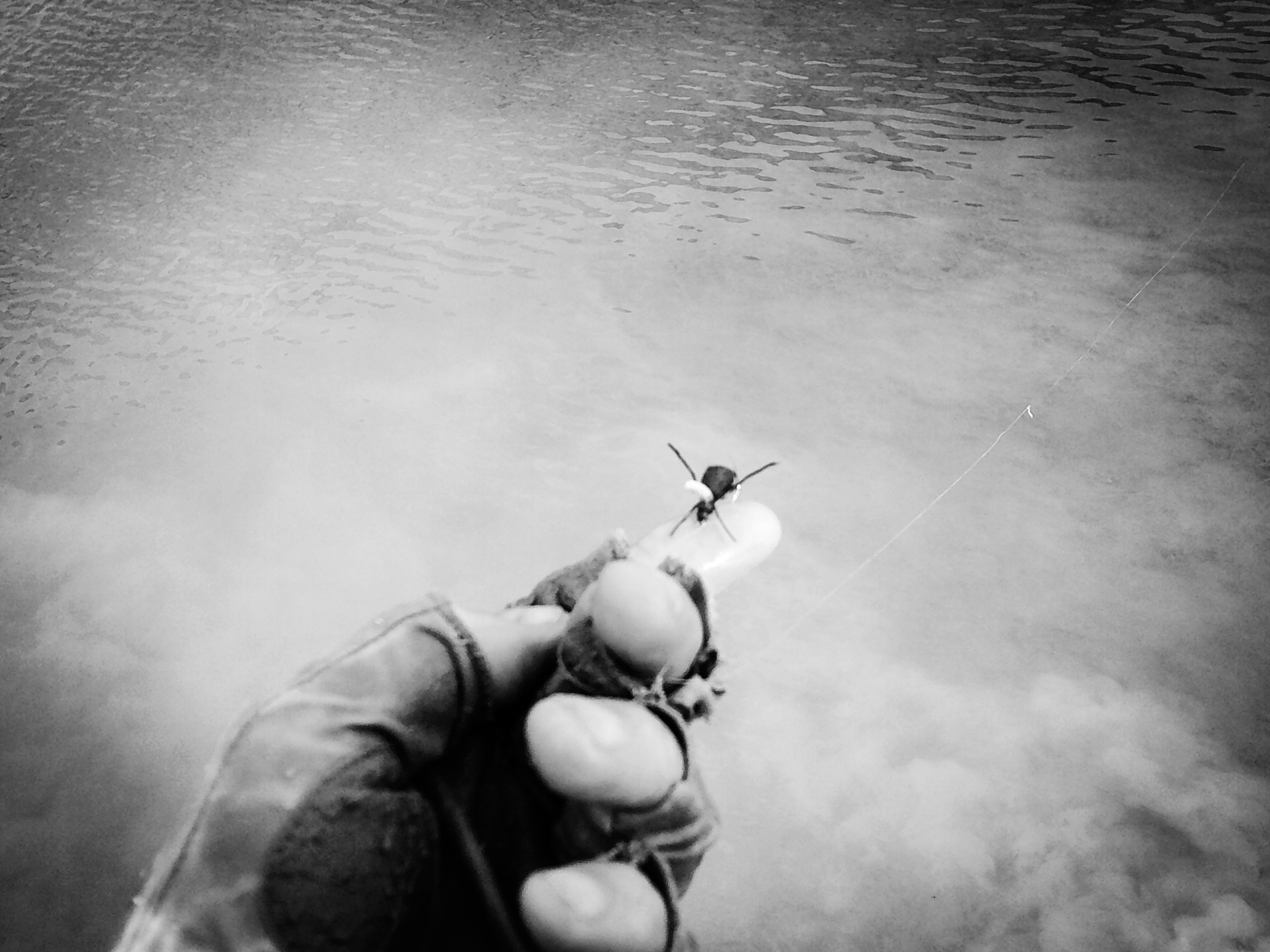 When I locate a trout at river level I don’t want to “hit it on the head” in the shallows with my chosen fly, especially if I’m casting a terrestrial pattern that has some bulk/weight. It might bolt if I do. I try to cast just slightly upstream and off to the right or left of the fish, let it notice the “plop” and then hopefully watch it move over and investigate.