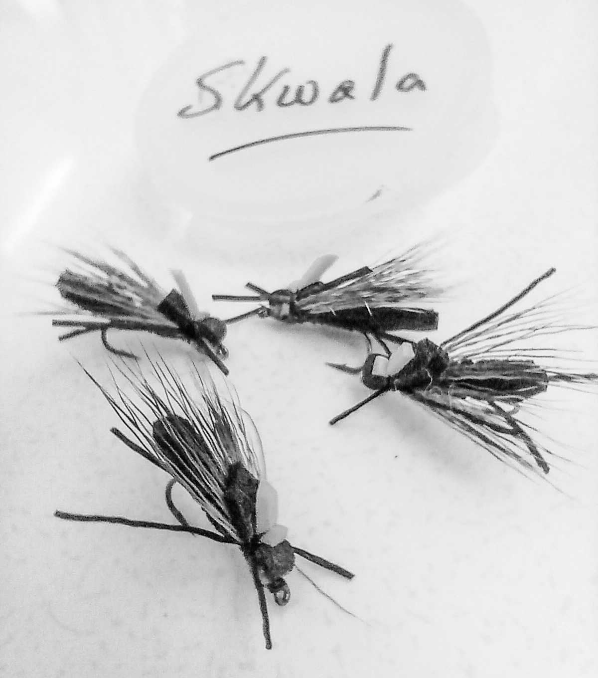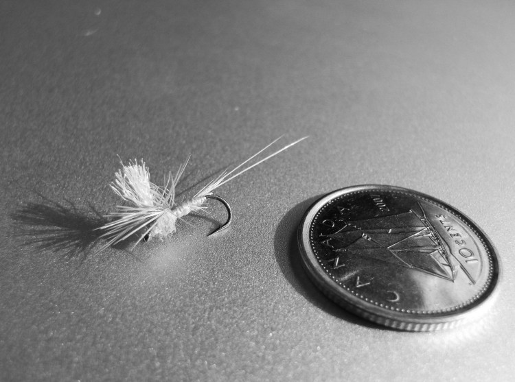When I dropped down from my perch I lost sight of the trout because of the grey skies and reflection. I had to wait for a rise. I chose an upstream position as most of the time the trout was looking downstream. I stayed real low, hugged the ground and waited for the a rise and then placed a small ant pattern nearby. I watched my impression and studied the mercurial surface for floating insects. There were some dark mayflies. Slightly larger than a Blue Winged Olive (BWO). I spotted a few even larger mayflies. Some but not a lot.