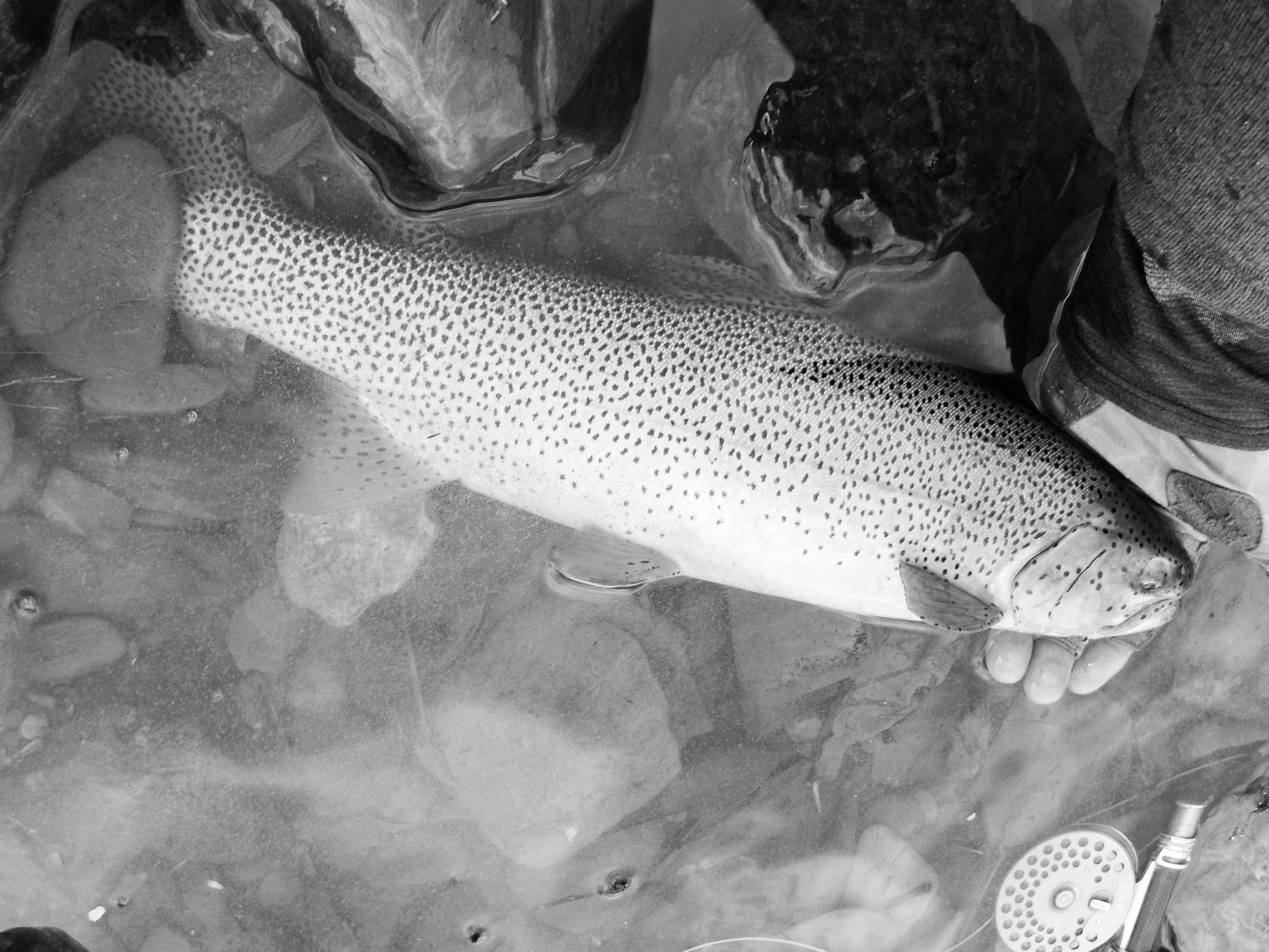 Flows are low for this time of year on a local tailwater river and water clarity, for now at least, is excellent. Usually it is high and off-color in late May. I took advantage of the good river conditions and a forecast that called for cloud cover and minimal wind, hoping for a good hatch of Blue Winged Olives. The hatch was good. Fish were up. I casted emerger patterns mainly size 18: fly body breaking the surface and a wing (white or black depending on surface glare) simply for a bit of flotation at eye of fly and for visibility. A few photos of Rainbow trout.