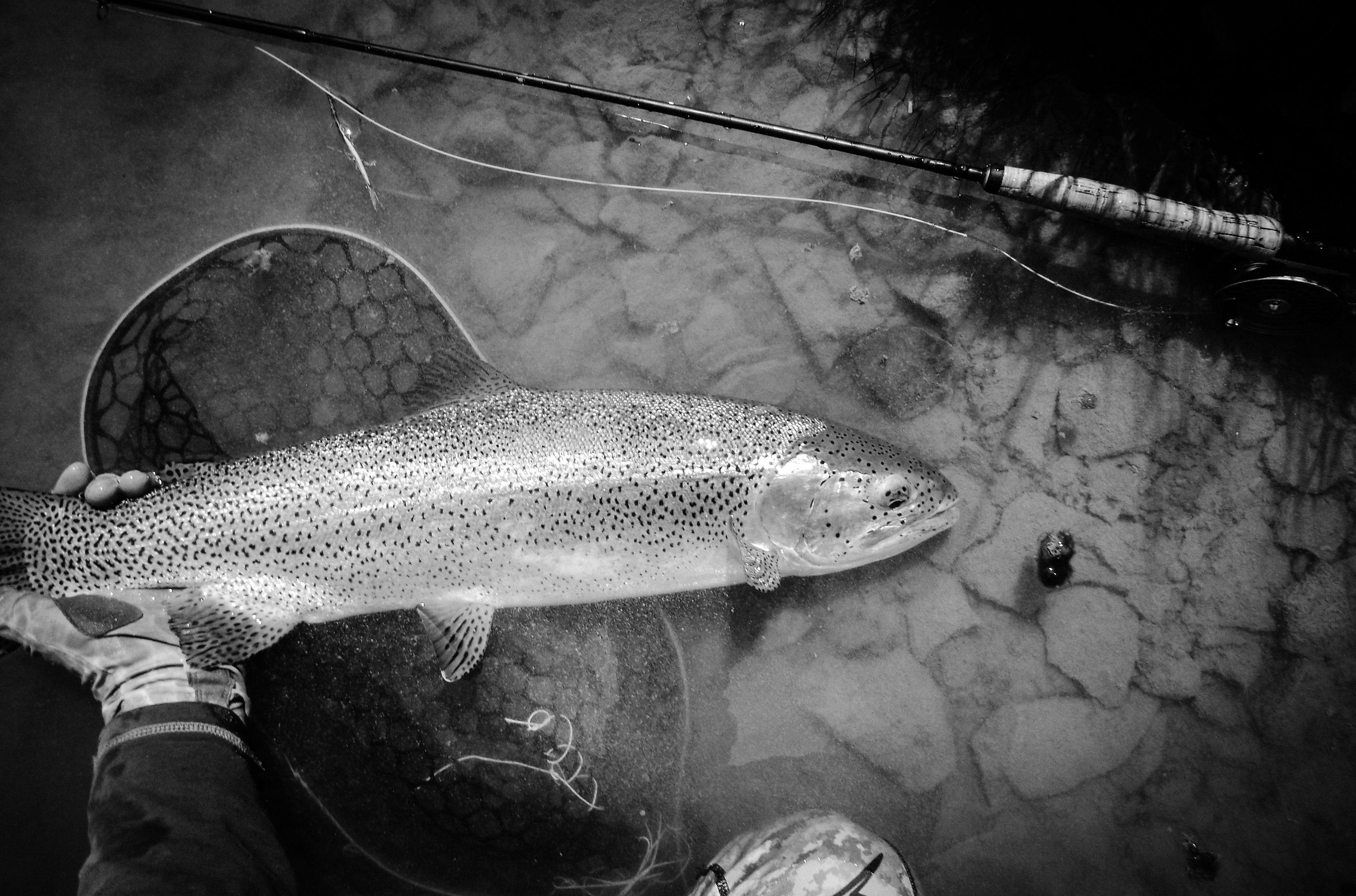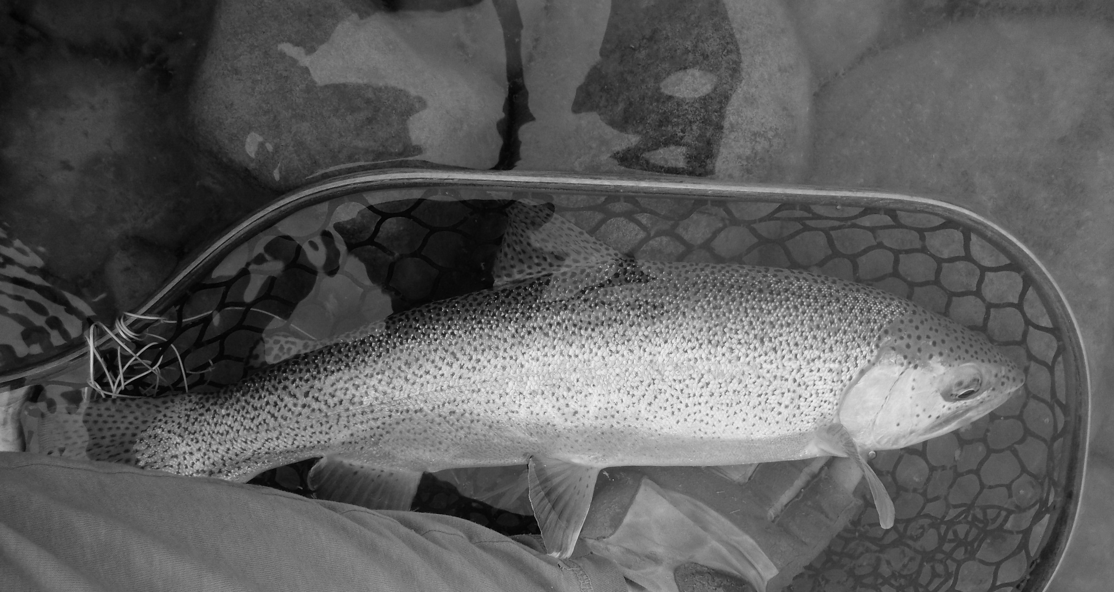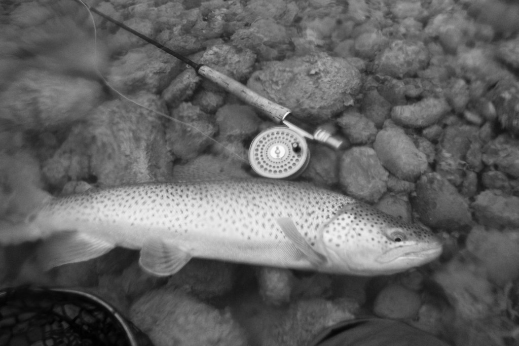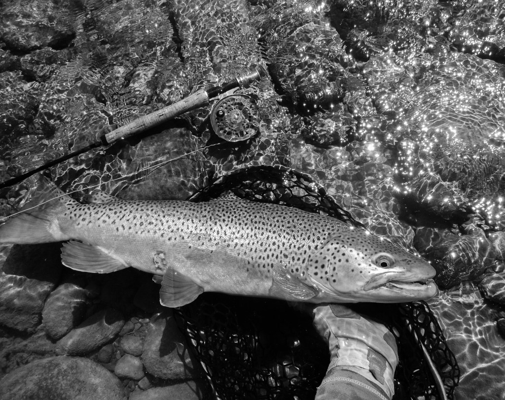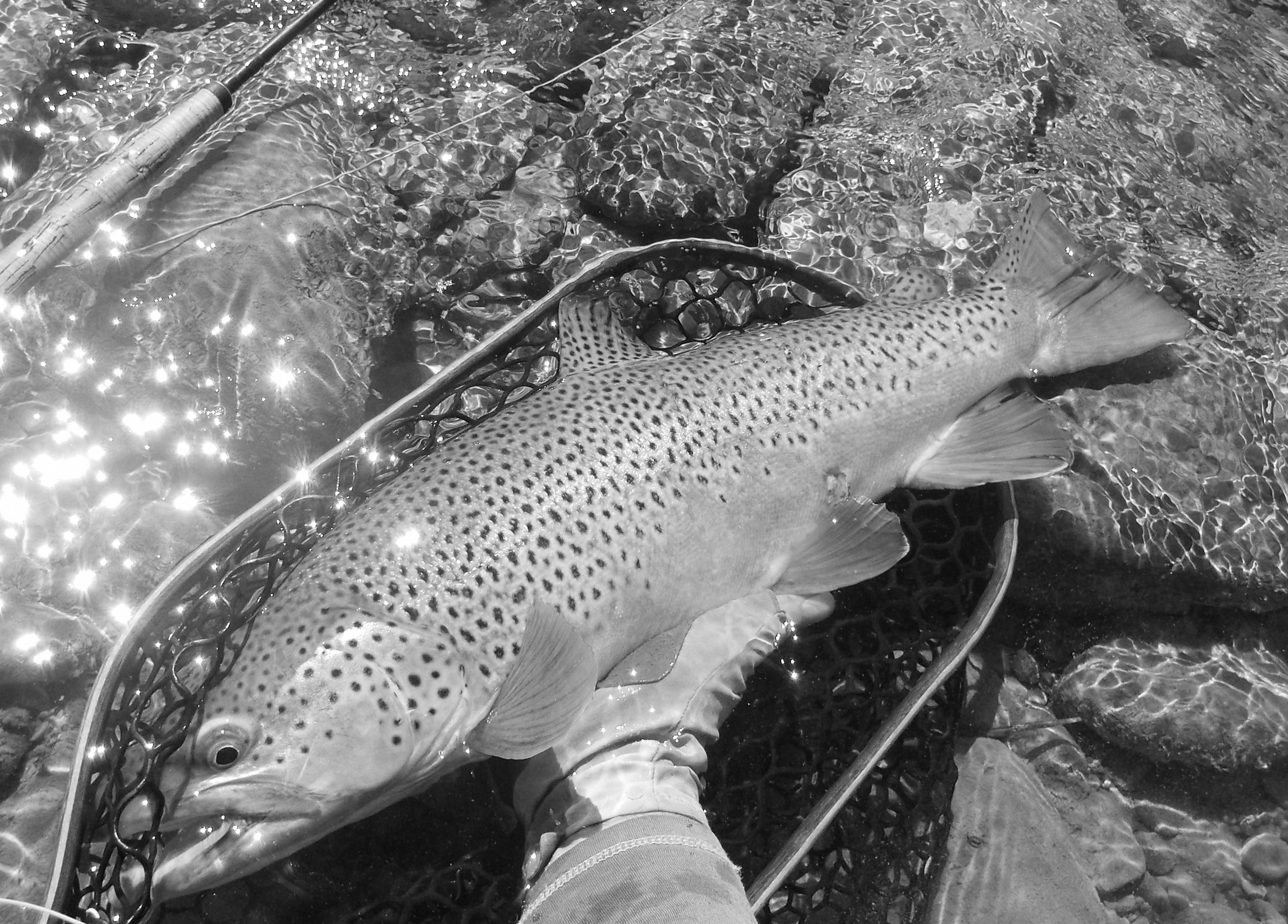 Here’s a fine brown trout caught in the shallows on a simple (flat) black ant pattern (size 16) I tie. Local rivers have dropped and most are clear. Trout are starting to look up and take dries…
